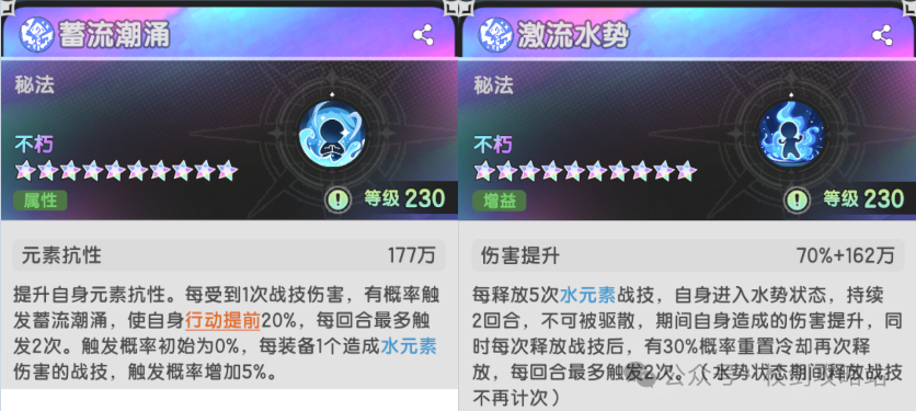 蓄流潮涌:提供元素抗性,每次受到战技伤害有概率让自身行动提前20%,每回合最多2次,碰到多段伤害,或者在对群环境下很容易吃满。注意,技能本身的概率为0,需要装备可以造成伤害的水系战技才能提高概率,一个提升5%,纯水触发概率为20%,也就是绑死水系技能了(3水+天雷也可以玩玩)。