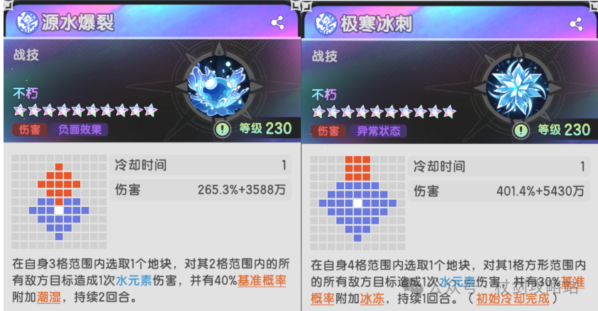 激流水势:每释放5次水系战技,会进入【水势】状态,持续2回合不可驱散。水势:持续期间提升伤害,释放战技有30%概率重置冷却再次释放,每回合最多触发两次。