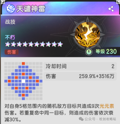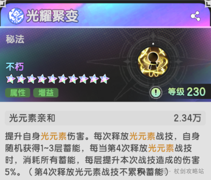 光耀聚变:超高的光元素亲和,使他替换了原本光法第三个加伤技能的位置,而且蓄能的叠buff机制,要保证在技能搭配上要把高倍率的天雷放到第四次释放,确保吃到加成。