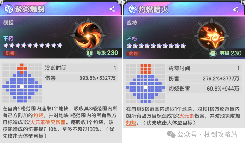 聚炎爆裂:一回合小范围的火系技能,可以吸收灼烧(地火)来提高伤害,并且不论这个地火是谁施加的都可以吸收,最高提供100%的伤害提升(吃满增伤后达到800%倍率)。