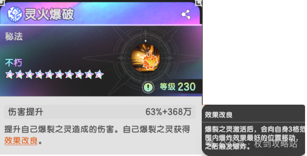灵火爆破,五转粑粑怪的售后技能。灵火爆破:技能效果简单粗暴就是提升爆裂之灵的伤害,并且给粑粑怪加个AI智能导航。激活了以后会自己找人炸。
