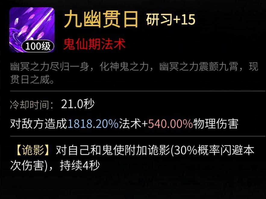 在闪避方面,剑修神通《隐天剑式》虽然有幻象效果,但持续时间较短,效果较难发挥。这个领域的专家属于鬼修的鬼仙神通《九幽贯日》,30%的诡影效果可以闪避一切类型的伤害,包括墓音、本命等“究极大杀器”,闪避一段伤害都是大赚。且该神通在加点守御等级后持续时间还能多延长1秒,达到5秒时长,闪避区间相比其他闪避类神通长太多了,还能为鬼使一同闪避伤害,效果拔群。在目前的战斗环境里,我非常推荐鬼修都携带这个神通,拉锯战里既有下限也有惊喜,是不可多得的好设计。