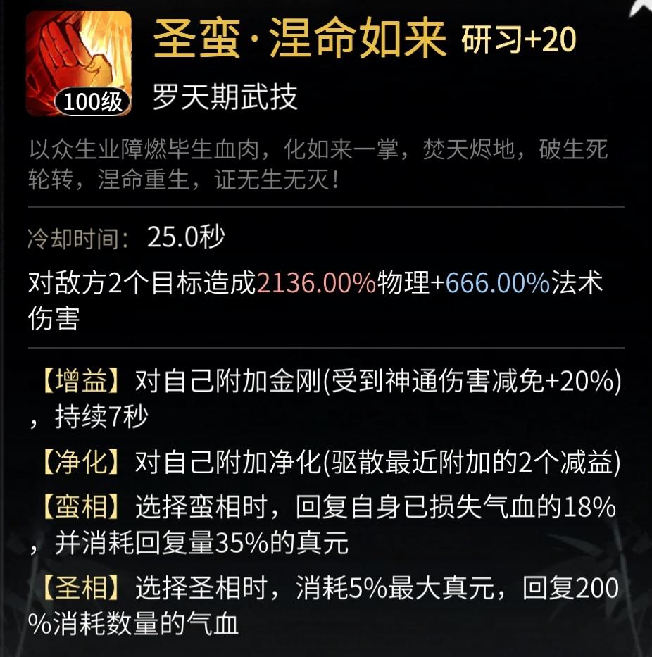 首先是体修罗天神通《圣蛮·涅命如来》的蛮相效果:回复已损失气血的18%,并消耗回复量35%的真元。这个神通的真元利用率为1/0.35=2.857,即每1点真元的回血以护盾计算,是2.857护盾,节省真元效果大幅强于普通的真元护盾;同样,体修真武神通《圣蛮·双龙护体》的蛮相效果回复已损失气血的15%,并消耗回复量40%的真元,其真元利用率为1/0.4=2.5,也强于普通的真元护盾。如果感觉缺蓝,可以携带这类高真元利用率的回血神通代替一个真元护盾,节省真元的效果还是很明显的。