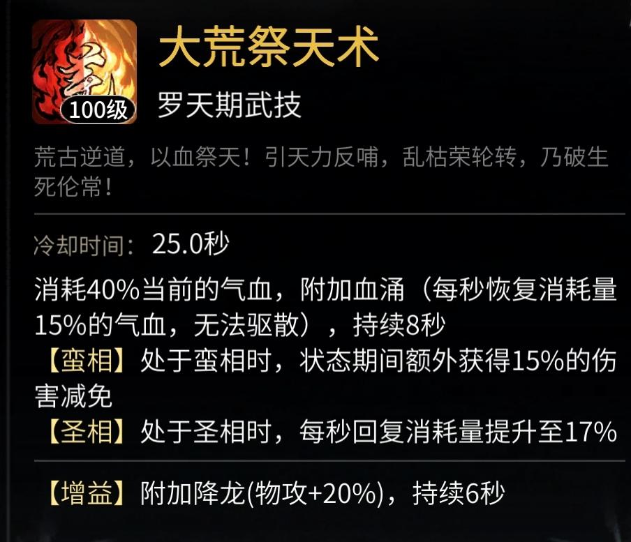 而减伤方面,应用较多的是体修的仙图,不屈在气血较低时提供最多65%的减伤效果,而这部分减伤在计算时最为优先,能大幅降低打在护盾上的伤害。另一个重要的减伤神通为体修罗天神通《大荒祭天术》,蛮相效果可以提供8秒15%的最终伤害减免,一个口诀为:圣相省血,蛮相省蓝,意即如果缺气血,使用圣相大荒效果更好;而如果缺真元,蛮相大荒的减伤效果能节省不少真元,可以根据具体问题调整法相。