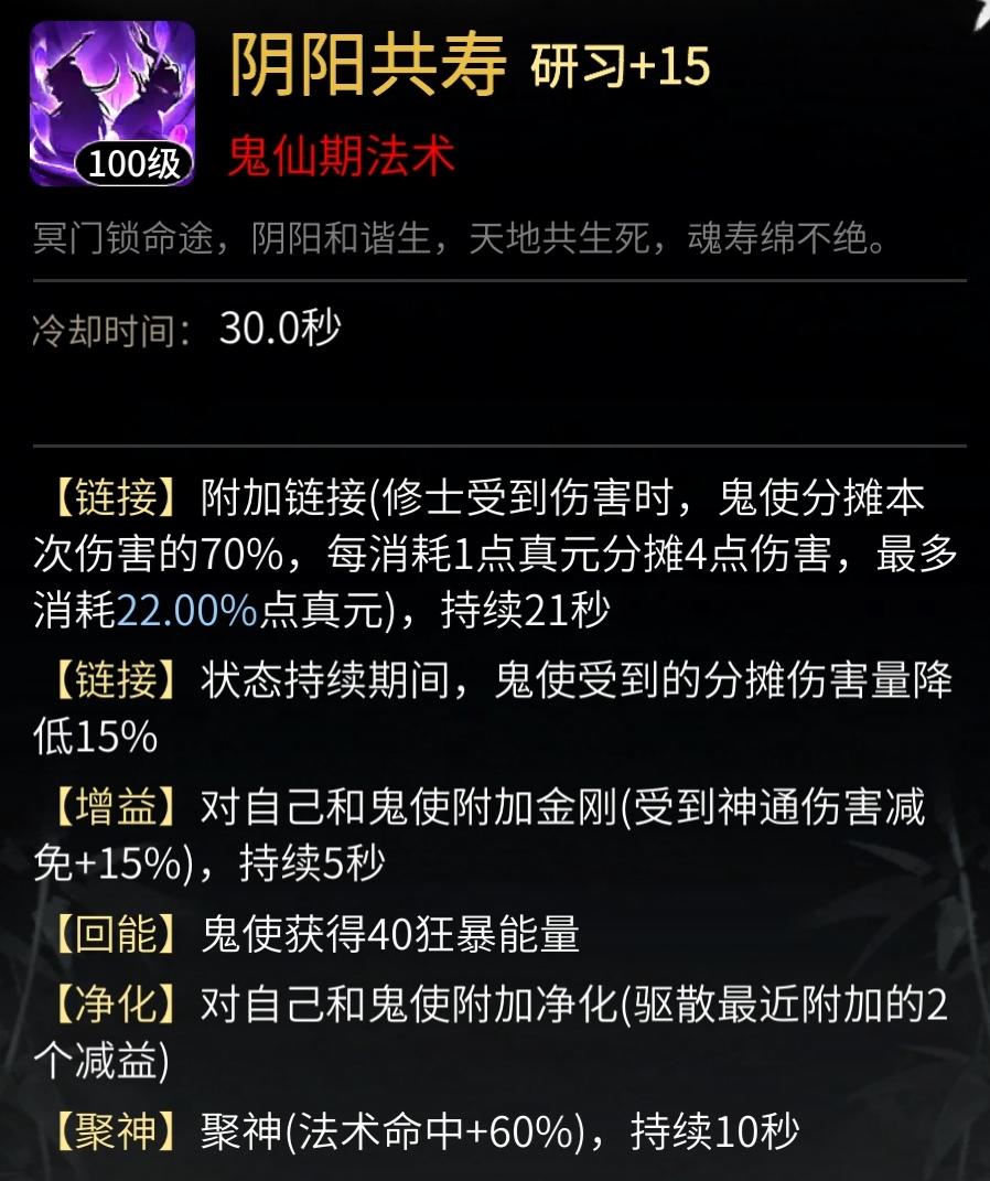 其次是鬼修独特的命魂链接类神通,以鬼仙境界的《阴阳共寿》为例,鬼使将分摊受到的70%伤害,每分摊4点伤害损失1点真元,最多损失22%真元。虽然这个神通本身的真元利用率高达4.0,但鬼使是通过损失真元召唤的,鬼使失去气血也等同于人物损失真元,综合考虑这一点后,这个神通的真元利用率约为2.3,也高于普通真元护盾。但有一些小伙伴疑问为什么携带阴阳共寿后自己的真元消耗反而增加,这是因为注意这个神通的描述:每分摊4点伤害损失1点真元,最多损失22%真元,即一共有88%的护盾量,这一个神通就相当于两个神通真元护盾的盾量了!因此携带命魂链接类神通时,就不要再携带更多护盾神通了,可以通过魔铠、仙壶等法宝护盾填充空窗期,由于命魂链接冷却较短,护盾循环还是比较容易的。