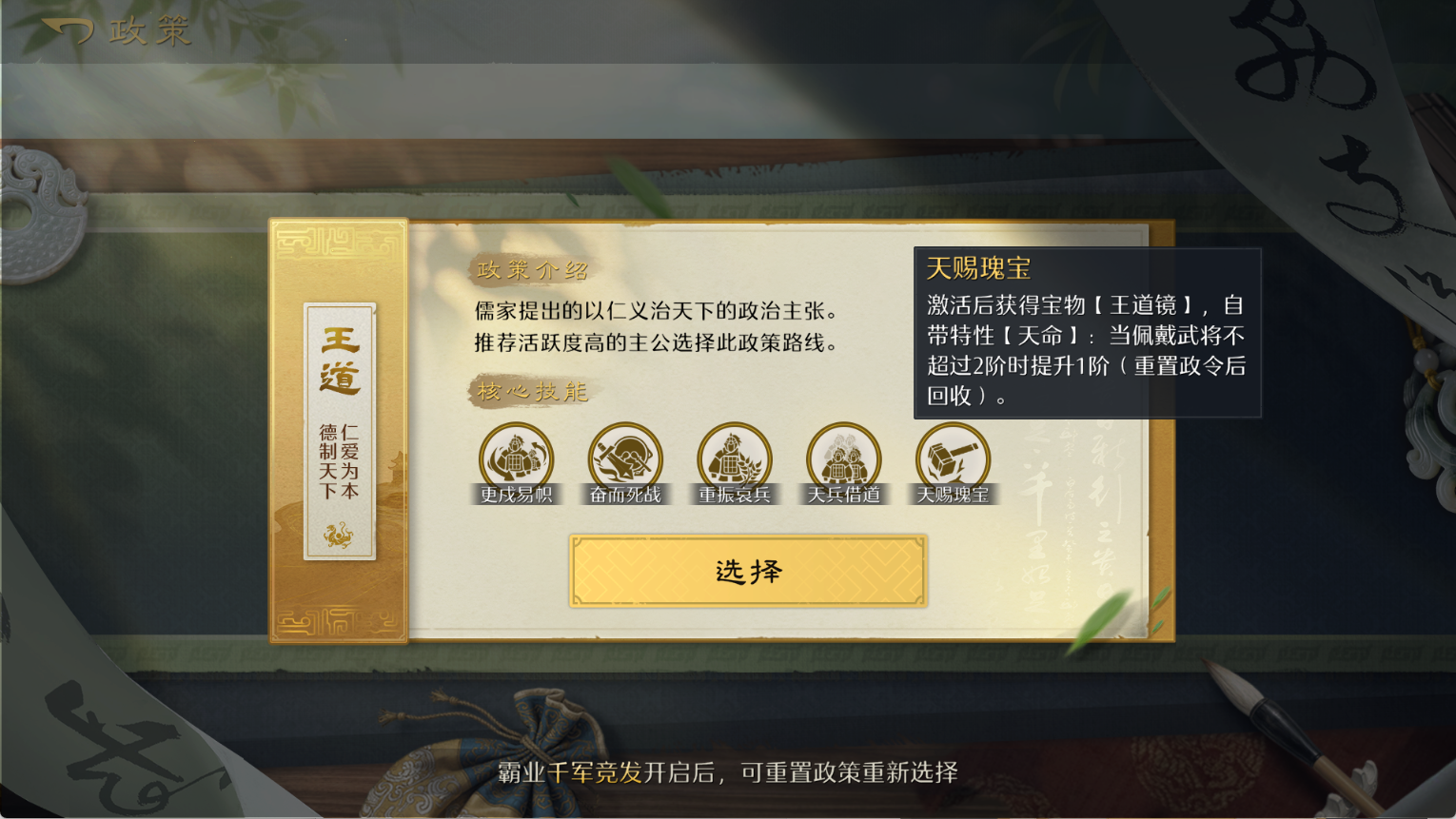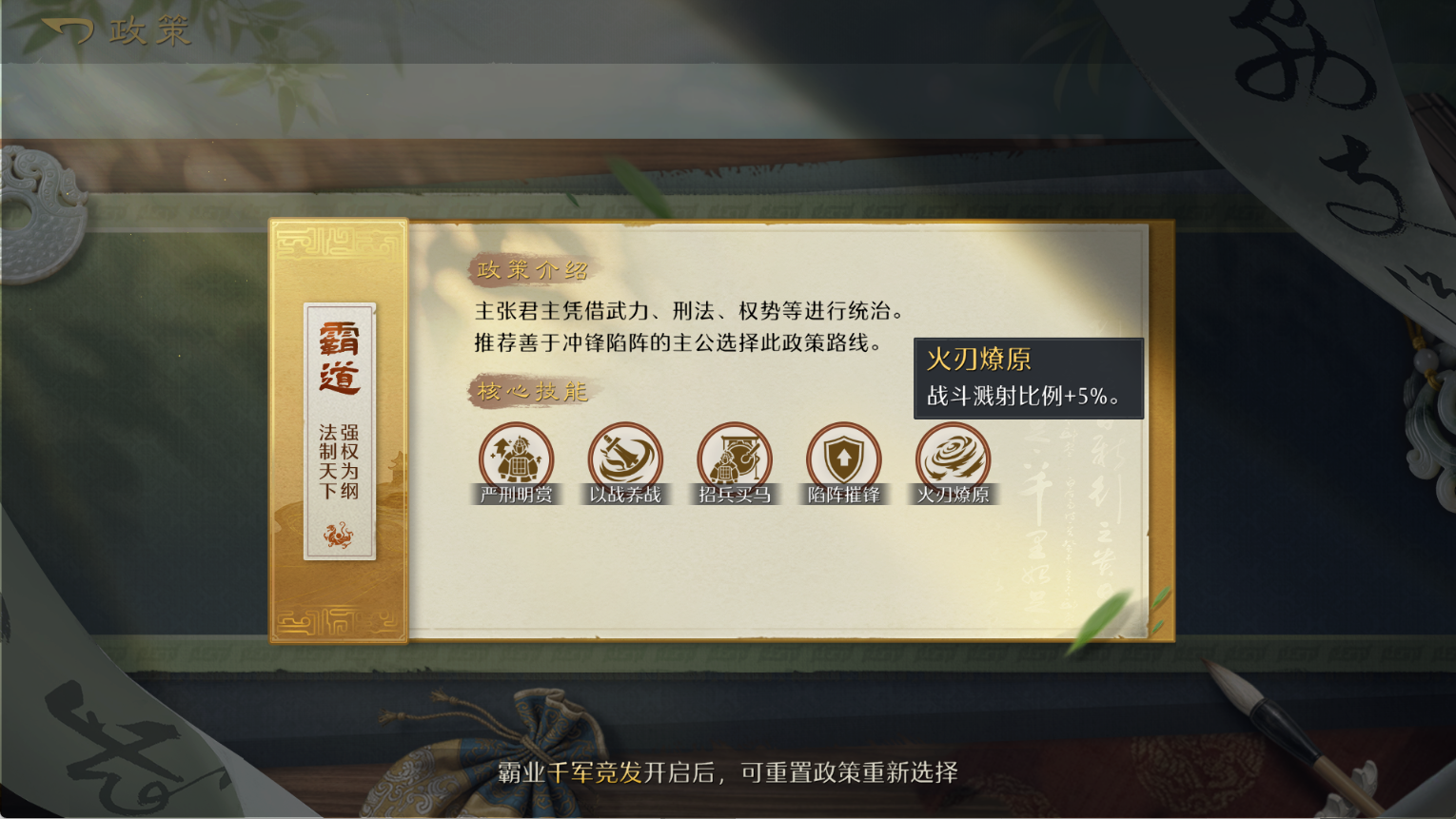 同时,我们也会获得额外2个政令点,累积获得8个政令点,便可以开启三大政策路线的核心增益技能——霸道的【火刃燎原】、王道的【天赐瑰宝】以及衡道的【鸿运垂青】。