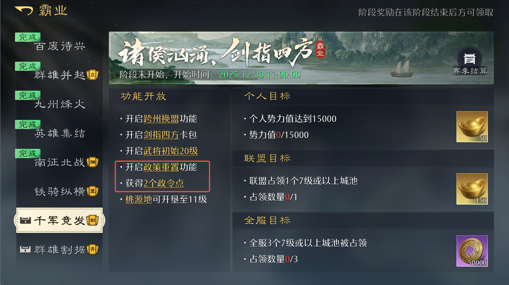 随着霸业进程的推进,明天首批区服将解锁【千军竞发】阶段,正式开启政策重置功能。