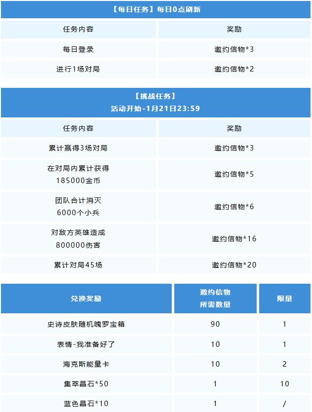 1、活动任务作为邀约信物的来源,分为每日任务与挑战任务,召唤师完成登录、累计对局等任务即可收集邀约信物,邀约信物累计达到指定数量可在兑换界面兑换奖励。