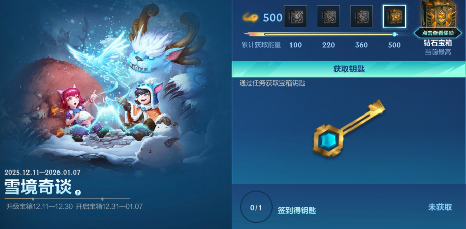 开史诗皮肤宝箱倒计时2天!截止至2026年1月7日,召唤师完成活动任务升级宝箱,即可于12月31日开箱最高免费获得随机一款史诗皮肤~