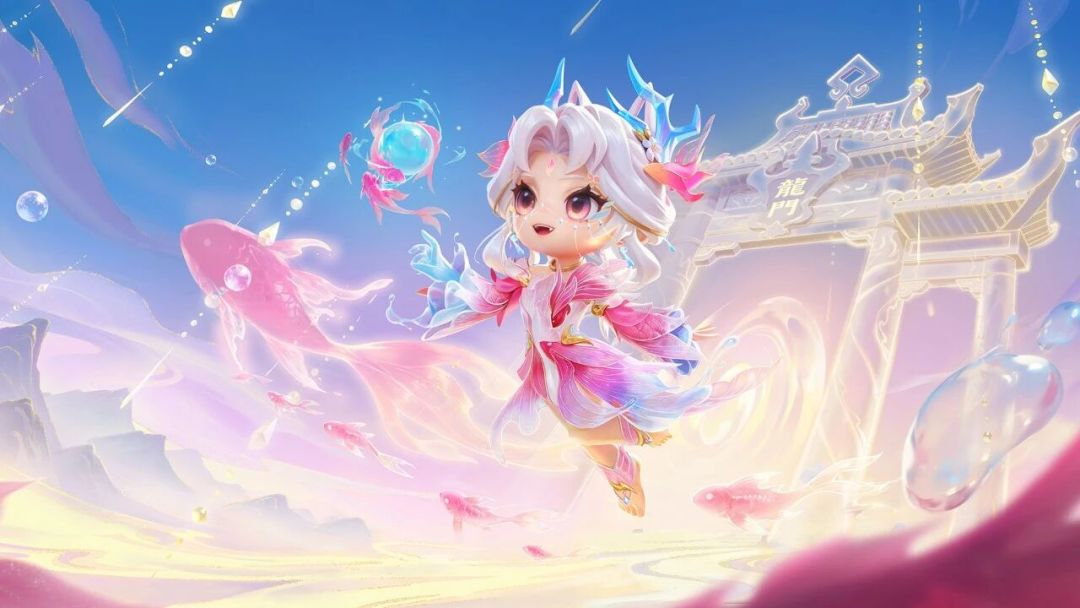 白色渐变发丝呼应锦鲤浅色系鳞片的光泽感,发丝蓬松且带有自然飘逸的弧度,模拟水波流动的轻盈感,面帘代替眼镜使整体更灵动。