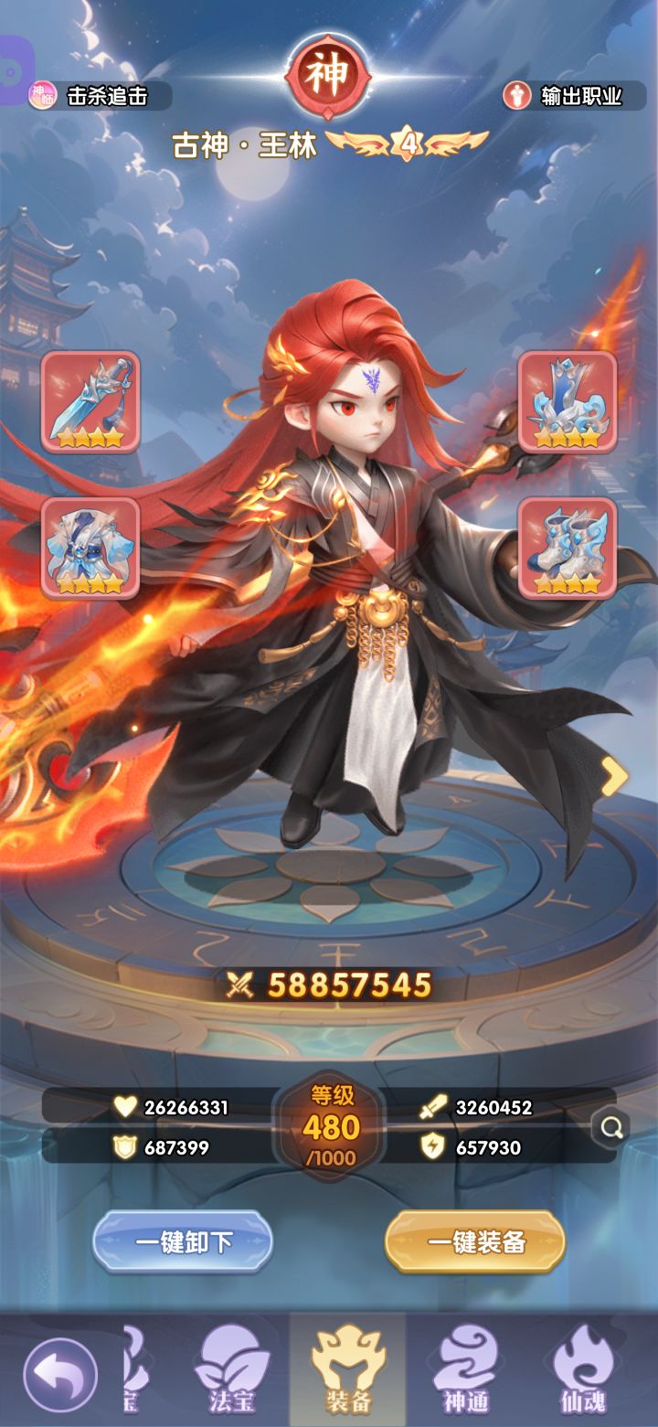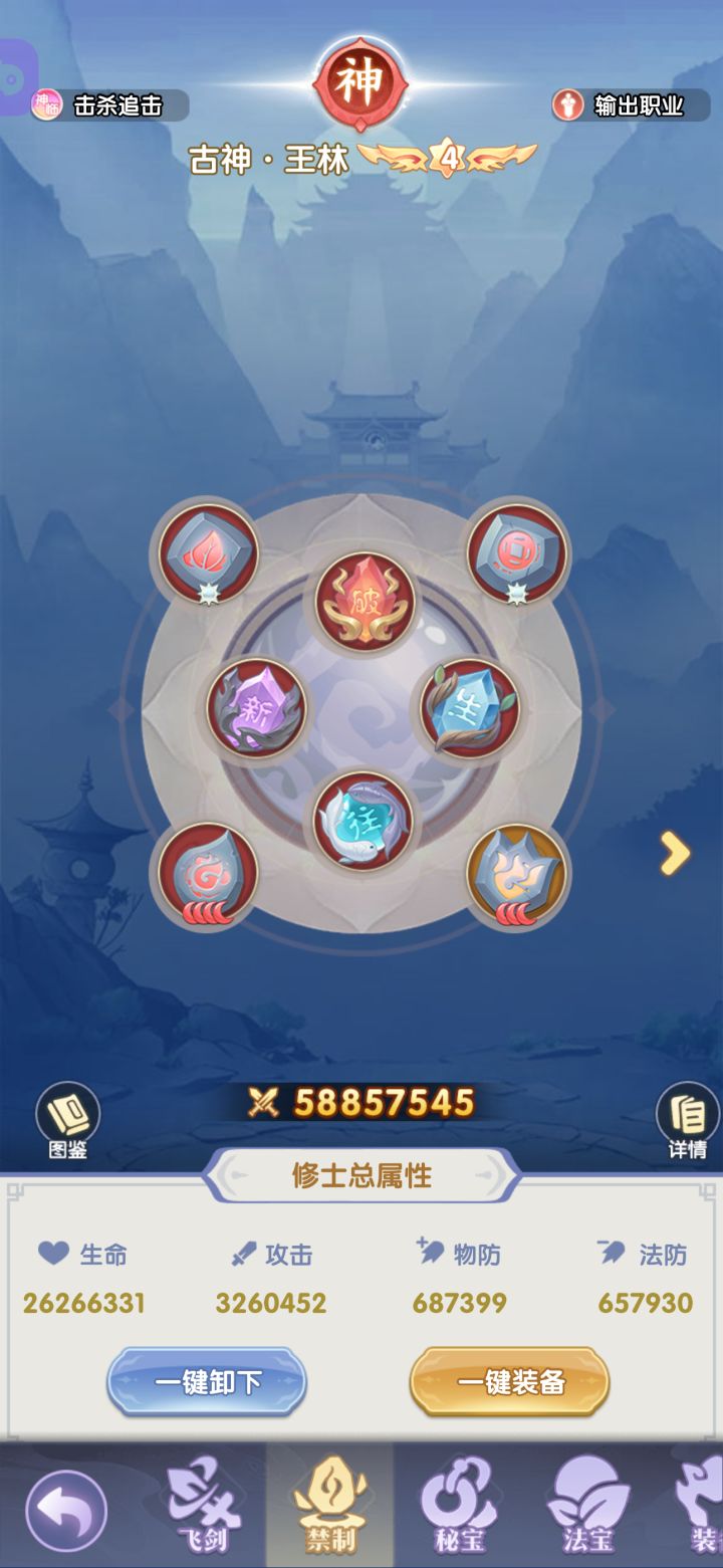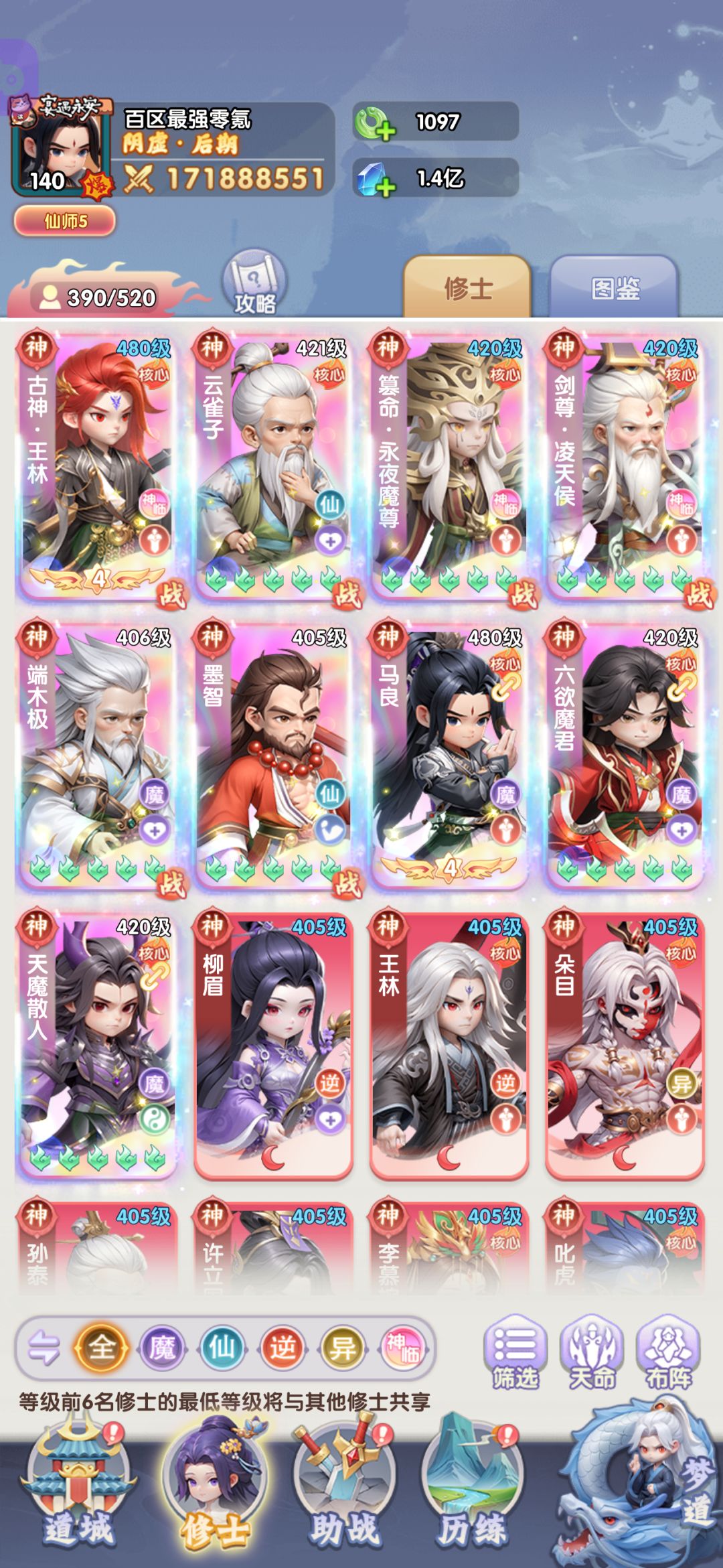 目前修士全部5绿豆以上,零氪资源有限,转追击没有足够的周轶胚子。后期考虑马良+腾一的玩法吧。主双c,传承3个神临过塔用。