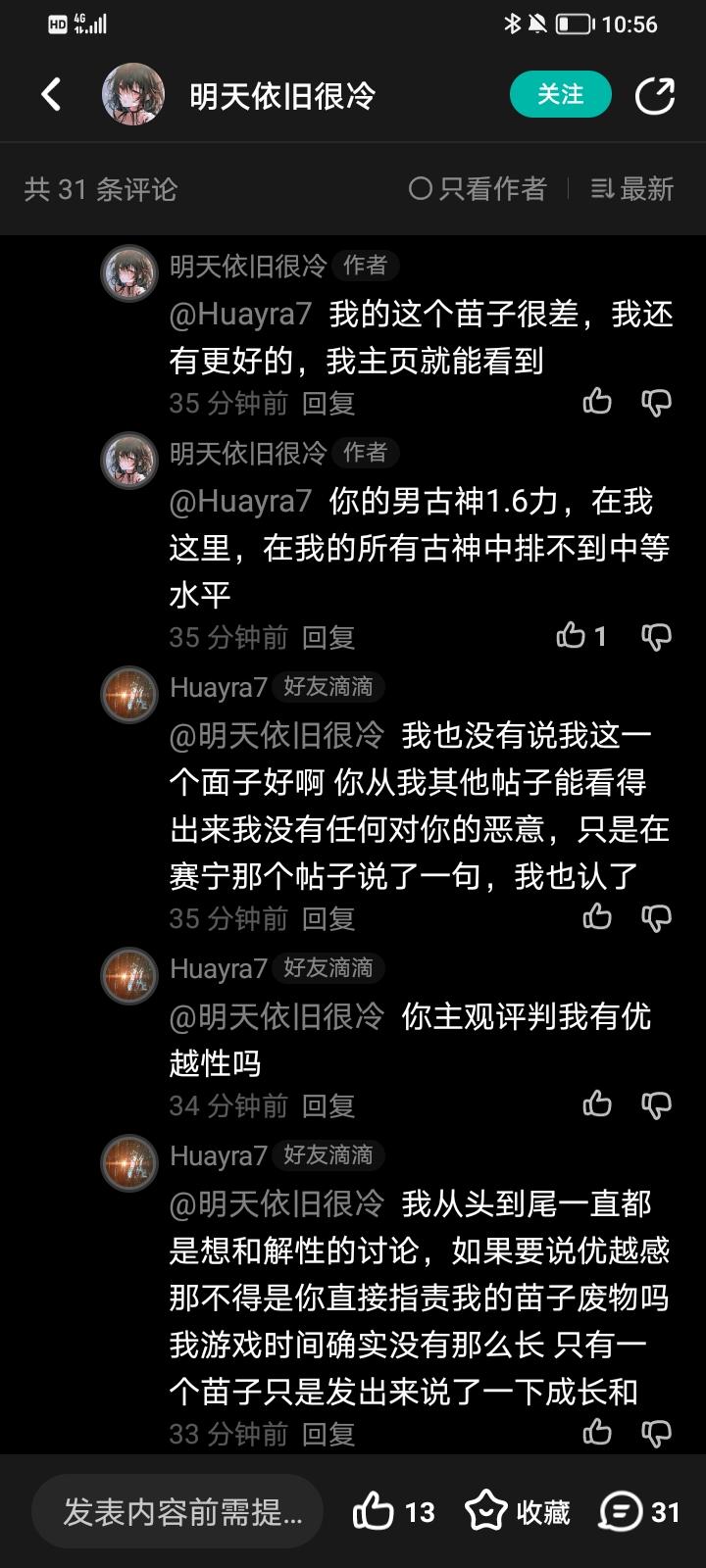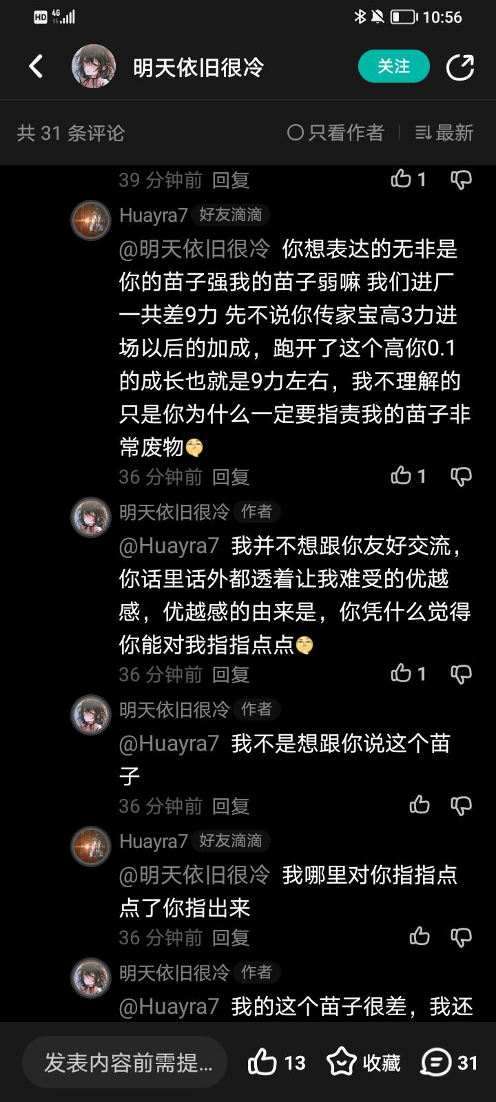 大家可以看到 他说他并不是想和我讨论这个苗子 而只是单纯的讨厌我的优越感 事实上,我发布了两张我的古神的照片,配了黄豆emoji,并且附上了我的传家宝力量数值。我不太能理解他是怎么觉得我有在带着优越感指点她的。从哪方面来看我都不会带有优越感:第一,我查看过他的主页,知道他有很长的游戏时间和丰富的经验,第二,只看这个苗子我也无法对他指点,只是对他说我苗子废物的这个称呼做出的应有辩驳。