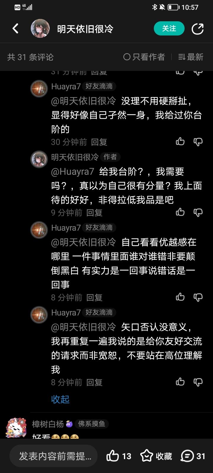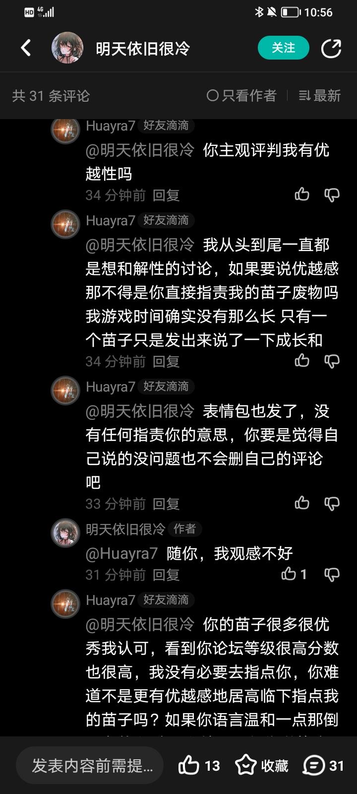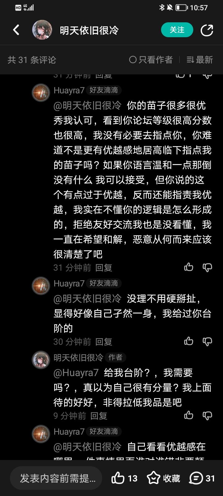 在后面回复里,这位大佬可能已经不知道该说些什么了,他以一句观感不好做成他认为我有优越感且指指点点他的理论,并且明确说不想和我友好交流,我其实一直认为不打不相识,即使讨论也应该是理性讨论,苗子的属性不应该直接导致争吵。在最后一次回复里,我跟他说出的给台阶下的意思是给一个和解的机会让两人友好讨论,而非宽恕他的错误,但是被直接曲解成施舍了 我就是想知道,既然你认为自己没有错误,那为什么要删掉一开始的评论,为什么要曲解我在给你宽恕性的台阶,为什么要拉黑我呢?如果你能跟我理论到底,我依然会选择和解。在包括最后说的,认为我太过于估计自己的份量了,这句话我也无法理解,既然你觉得这是不应该带优越感的问题,为什么又要拿自己的身份来压我呢?何必如此束手自缚?我如果批驳你对我的指责都是拉低你的品,请问你难道不是带着优越感来冲击别人吗?