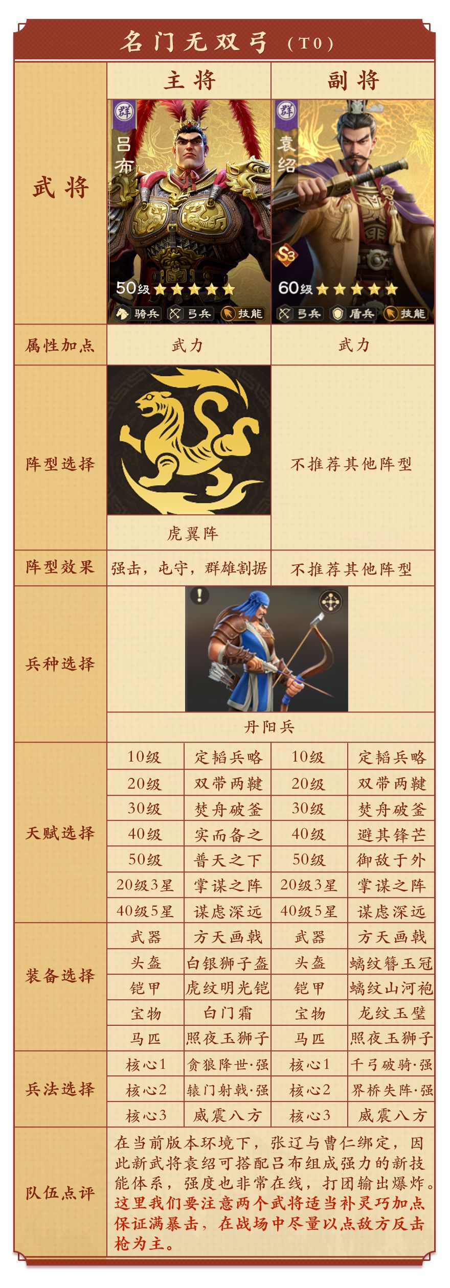吕布搭配新搭档袁绍,爆发能力非常惊人,回归S1的强势版本。该队伍可作为反集结队伍使用,野战表现也非常出色。团战中能有效针对枪兵体系。