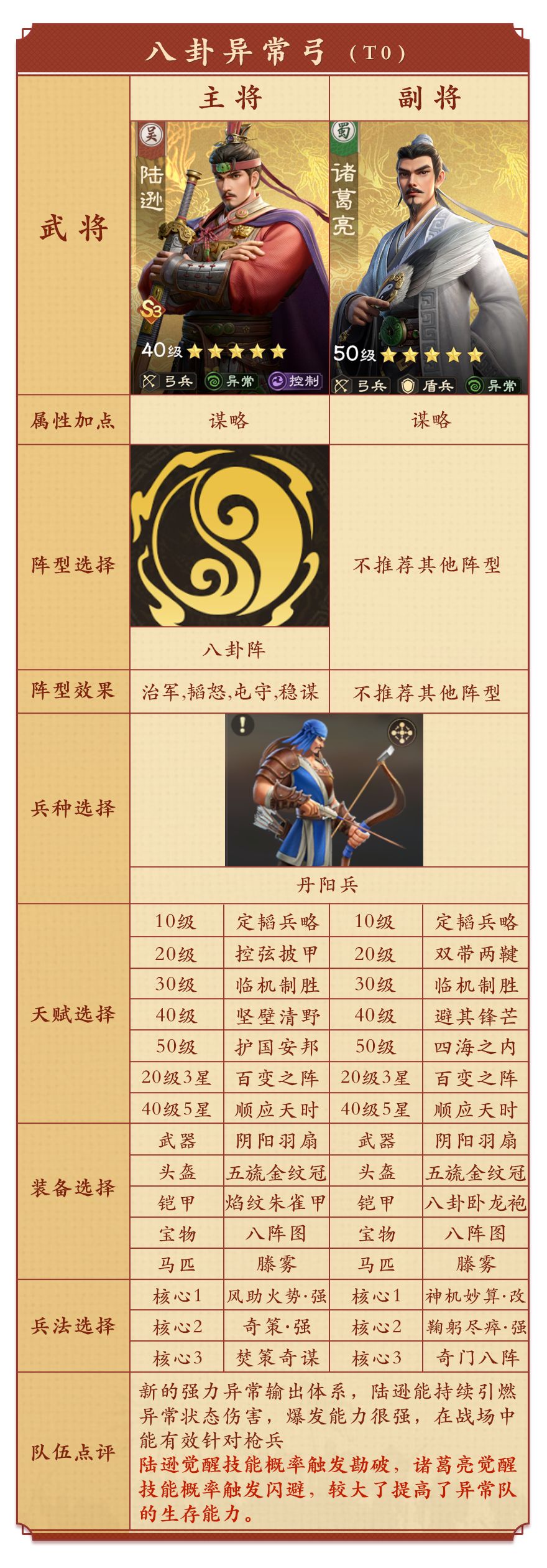 诸葛亮陆逊组成的八卦阵异常弓,陆逊独特的机制能够引爆异常状态的所有伤害,大大提升了异常队伍的爆发能力,能够在本赛季占据一席之地。