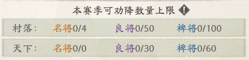 3、降将不要着急抓,可以留着。等到你后面把事件都做完看看自己想要哪个再抓,村落以及后续天下内容抓将每赛季是有上限的,尽量抓对你有用的将。