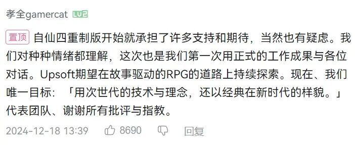 「自仙四重制版开始就承担了许多支持和期待,当然也有疑虑。我们对种种情绪都理解,这次也是我们第一次用正式的工作成果与各位对话。Upsoft期望在故事驱动的RPG的道路上持续探索。现在、我们唯一目标:“用次世代的技术与理念,还以经典在新时代的样貌。”代表团队、谢谢所有批评与指教。」