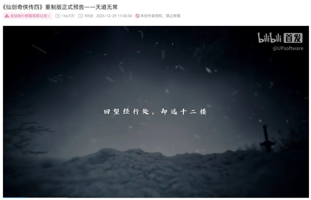 今天上午,《仙剑奇侠传四》重制版发布正式预告,视频播放量很快就突破了166万。