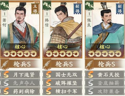 评价:重新介绍,S1目前没有枪兵种强队。个人建议萧何还是换成高红刘彻,因为萧何的增伤仅限第一回合,韩信又刚需横扫此类战法,所以增伤约等于没有。本队仅算T1中下。
