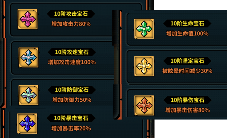 第四档:攻击力宝石,攻速宝石,防御宝石,生命宝石,眩晕减少宝石,爆伤宝石,暴击宝石