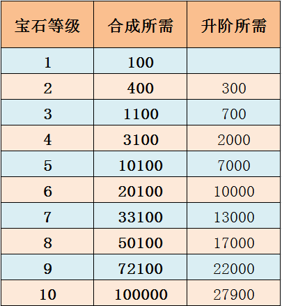 目前,宝石的分解与合成已无额外消耗,可自由操作。以下是各阶宝石合成与升阶所需的残片数量统计: