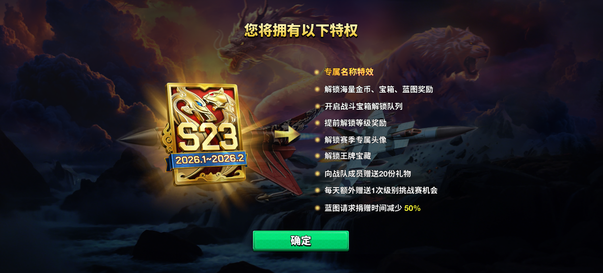 奖励内容S23 赛季手册重磅上线,满满奖励诚意十足,助你空战实力全面跃升!赛季头像: 虎先锋