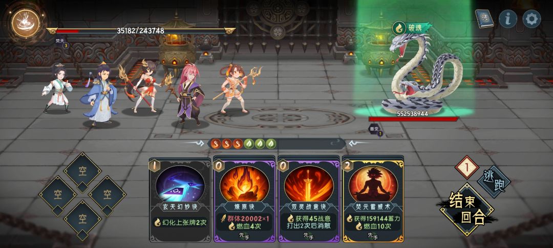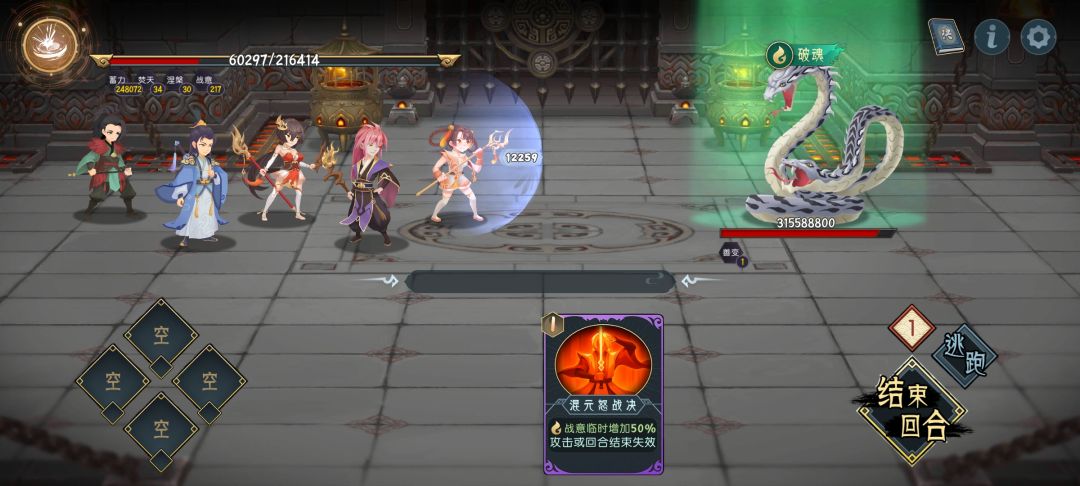 双蛇,凑5人,第一回合调破魂,然后挂机等火印毕方自动成长,挂机十几回合直接秒