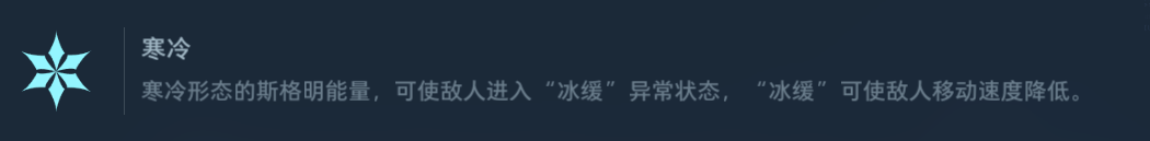 介绍:使用寒冷属性武器或技能命中敌人,有概率对敌人造成冰缓状态,可以使敌人的移速降低,冰缓层数越高,速度越低。
