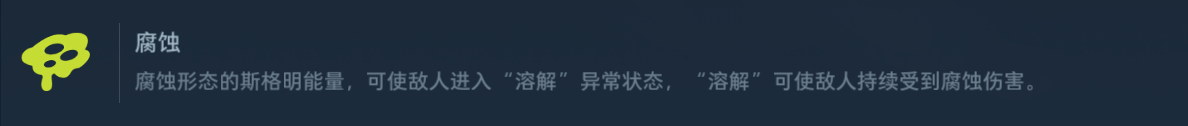 介绍:使用腐蚀元素的武器或技能命中敌人有概率使敌人进入溶解状态,溶解状态会使敌人持续受到伤害,叠加到一定层数后,溶解造成的伤害还会额外增加。