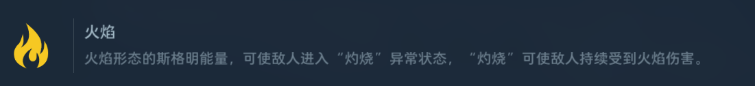 介绍:使用火焰元素的武器或技能命中敌人有概率使敌人进入灼烧状态,灼烧状态会使敌人持续受到与层数相关的火焰伤害。