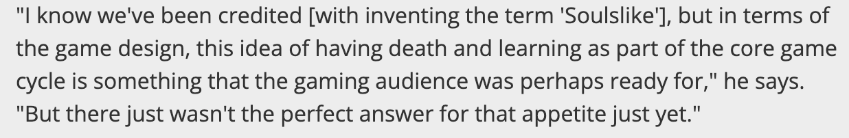 他向《Game Informer》杂志谈到了“魂类游戏”的来源,并解释说,From Software 实际上只是理解了一些玩家的需求。“我知道我们被认为是‘类魂游戏’这个词的创造者,但就游戏设计而言,将死亡和学习融入核心游戏循环的理念,或许正是玩家群体所渴望的,只是当时还没有完美的游戏来满足这种需求。”