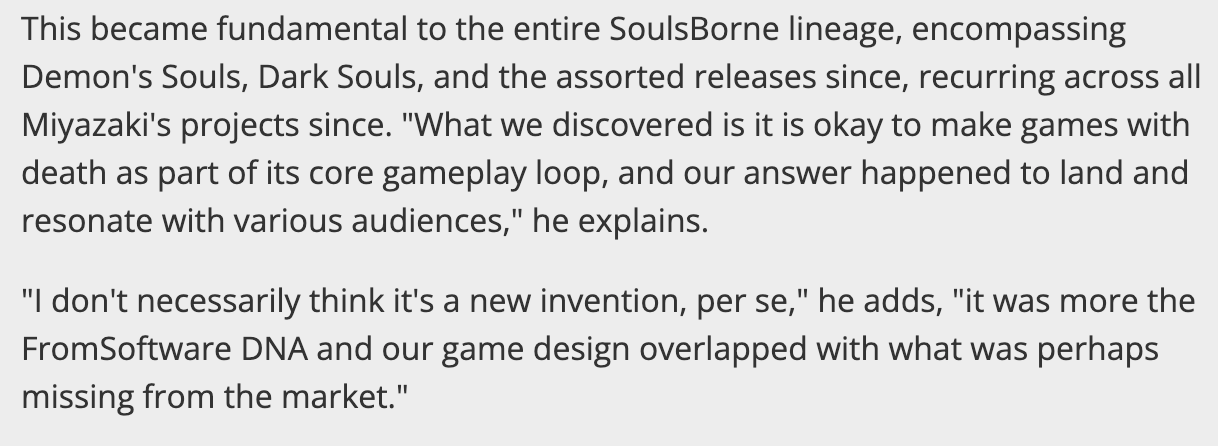采访原文“我并不认为这本身是一项新发明,这更多的是FromSoftware的DNA,以及我们的游戏设计与市场上可能缺失的东西的契合。”