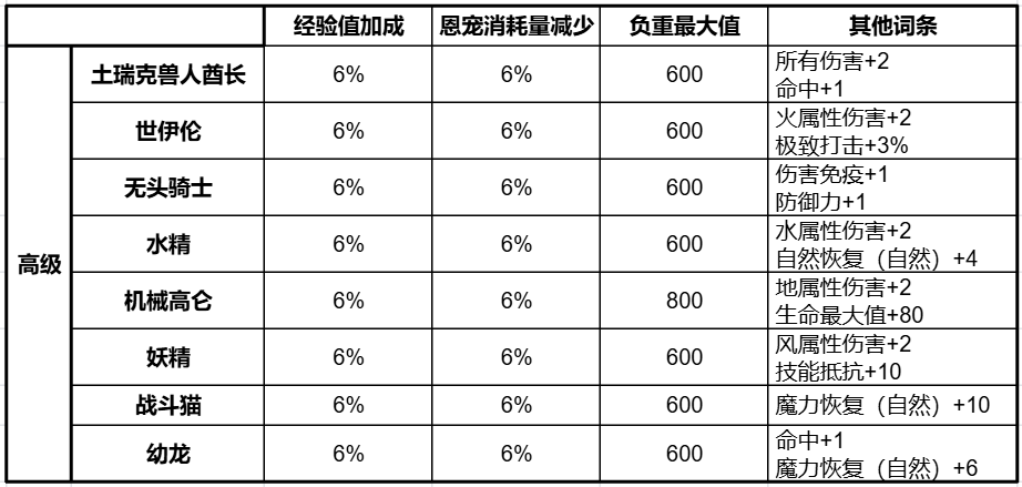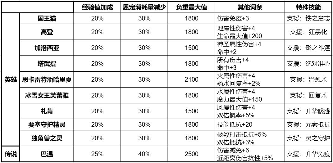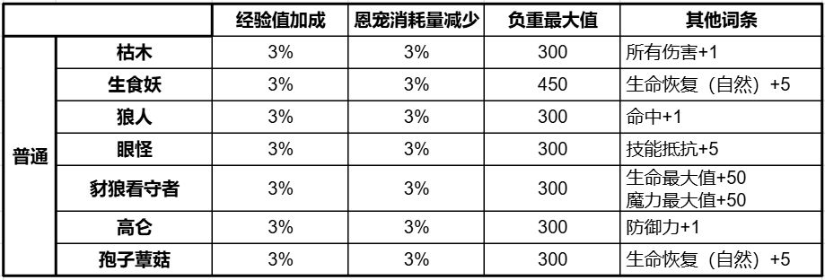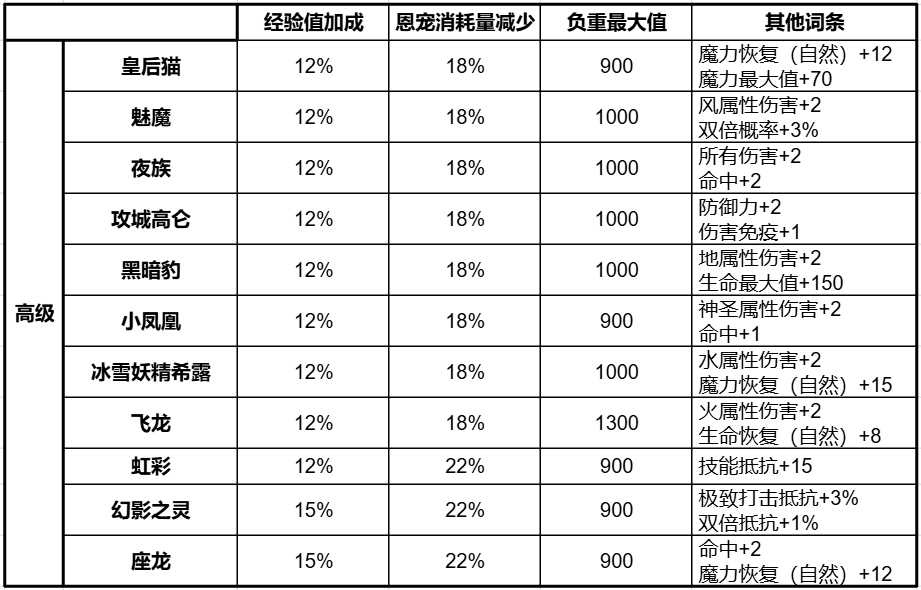 每只守护精灵至少有4条属性,品质越高的守护精灵属性词条越多!其中“经验值加成”、“恩宠消耗量减少”以及“负重最大值”固定存在,但同品质不同守护精灵的携带的数值不一样,剩下的词条属性也有差别~