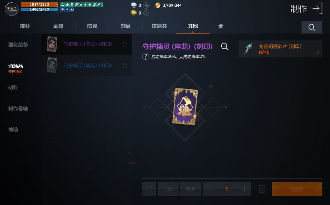 继承者们通过参与组队副本获得的“龙的钥匙碎片”,可以在【制作】-【其他】-【消耗品】中,用于制作特定守护精灵召唤牌哦!