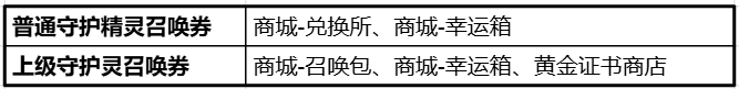守护精灵召唤券分为“普通守护精灵召唤券”以及“上级守护灵召唤券”两种!其中,普通品质召唤券除了任务和部分玩法可掉落外,每天都可以在商城用金币固定兑换一张哦~