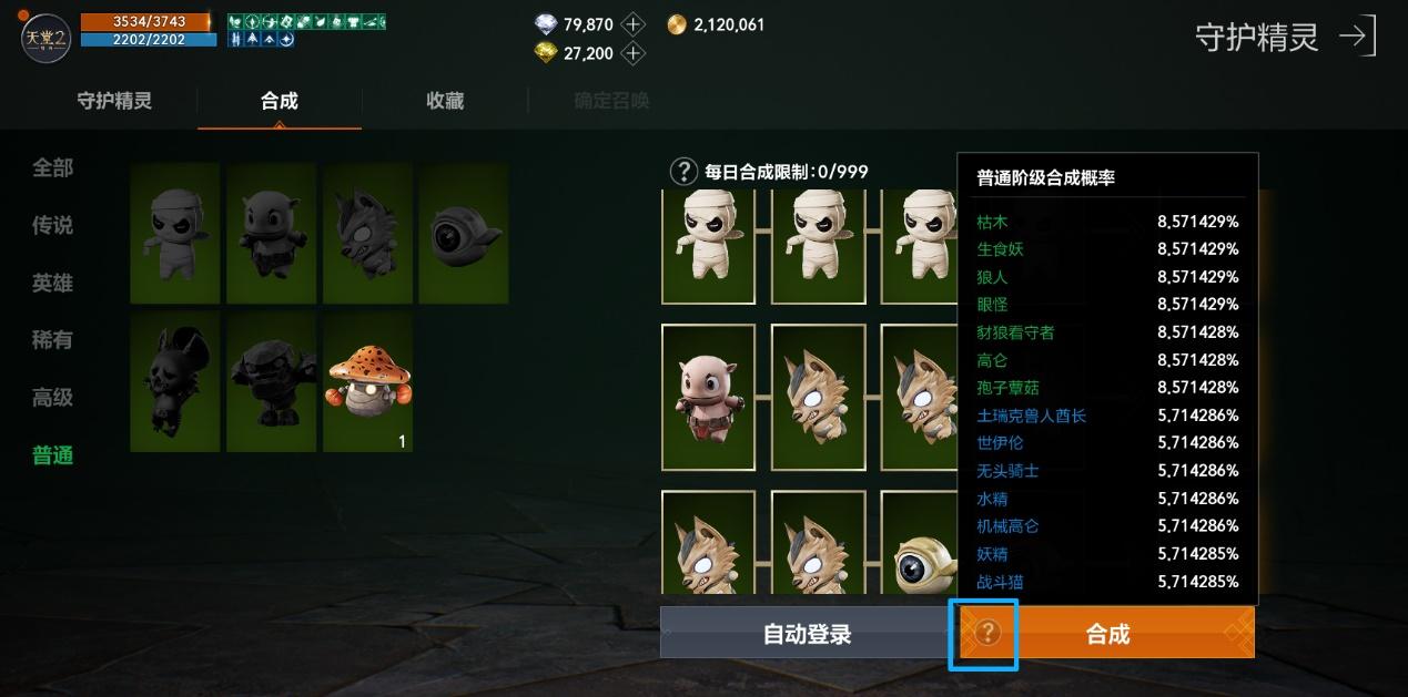 点击合成按键上的“?”,可以查看此次合成各种守护精灵的概率哦~