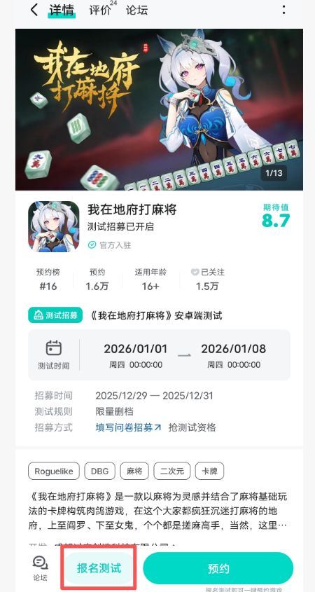 大家可以在游戏页面点击“报名测试”,欢迎预约哦~