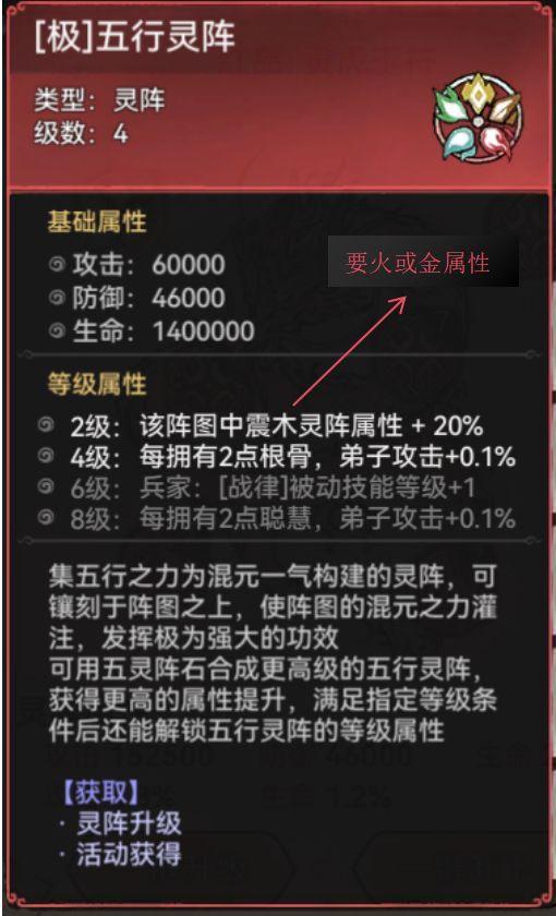 比较稀有,镶嵌在阵图的左上角,一般升到4级最佳,算上本体需要8个1级五行灵阵。