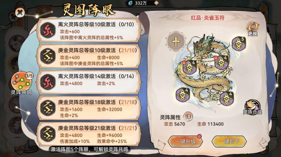 当玉符上镶嵌的灵阵总等级达到要求,即可激活对应的灵阵共鸣加成