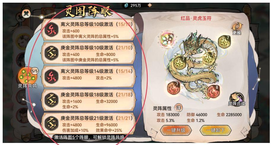 平民玩家一般也只能给主c配备一套,其属性加成与主c契合即可!如阿狸,五行灵阵的2级属性有火加成最佳;4级属性为资质、聪慧转攻击率最佳!