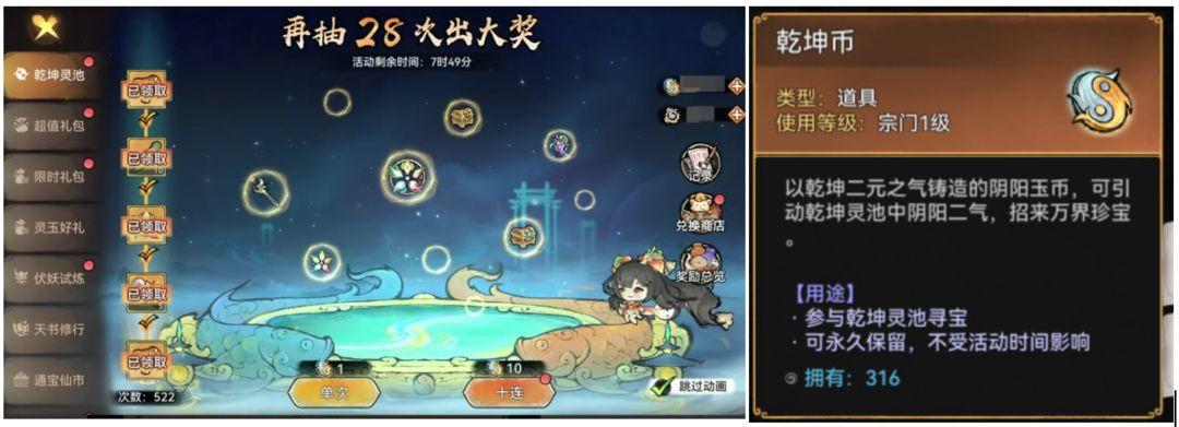 抽奖活动,需要抽奖道具【乾坤币】。不氪金的情况下,获取途径有天书修行、通宝仙市、伏妖试炼、灵玉好礼、每日签到、每日免费1抽(不可留存);