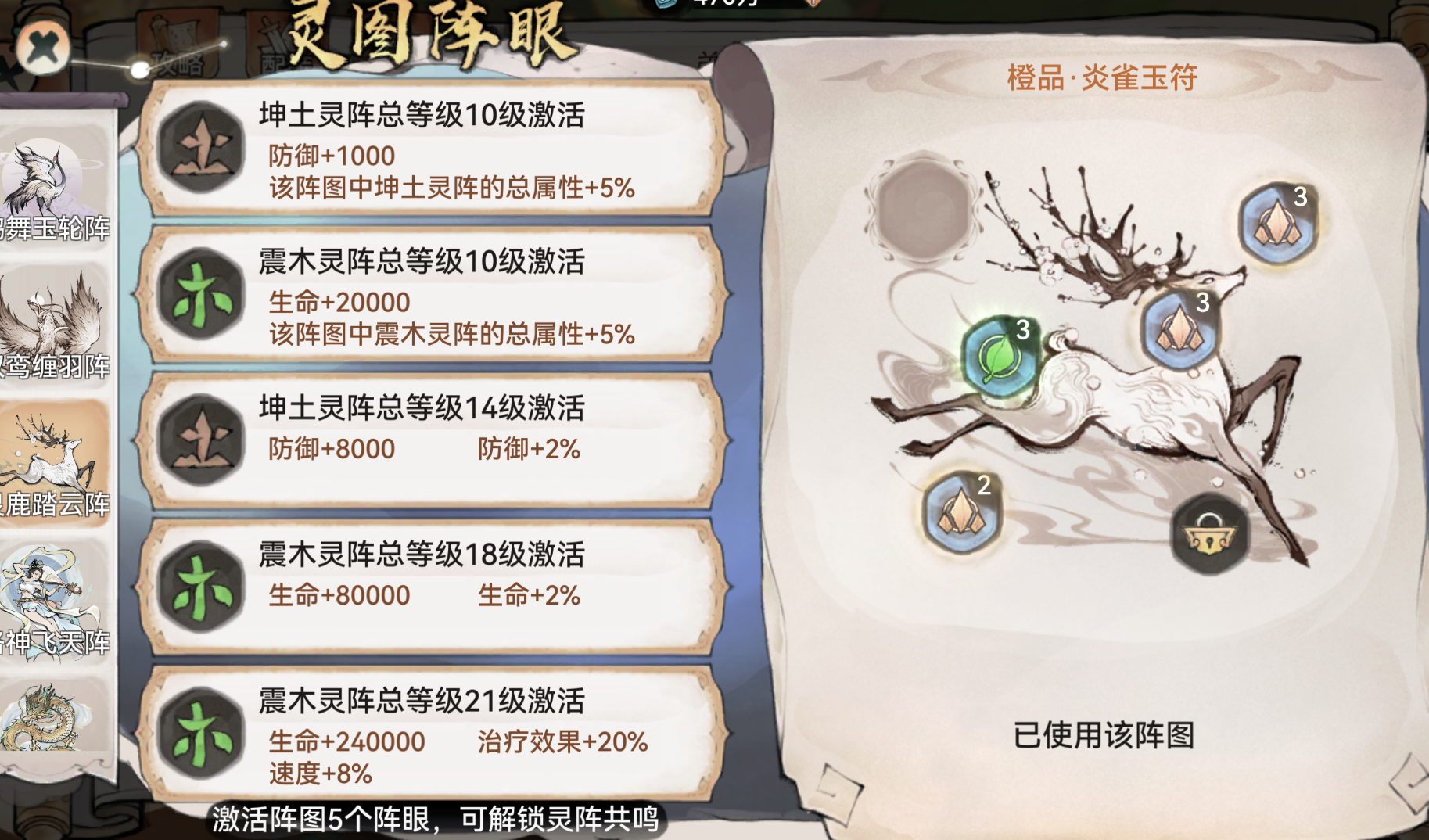 灵鹿踏云阵(鹿阵):木+土,主要加治疗效果、速度、防御和生命;