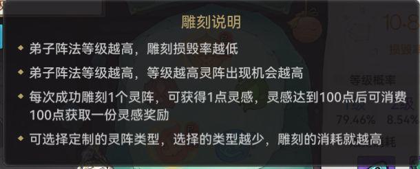 需要注意的是,雕刻有概率损毁拓片,在阵法九十以后不会出现这种情况了!同时弟子等级越高,雕刻获得到高阶灵阵的概率也就越高!