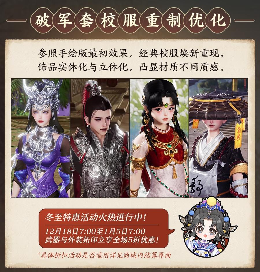 其中,破军套校服重制优化已正式上线,参考手绘版最初效果,将校服饰品进行实体化与立体化处理,凸显材质的不同质感,让经典款式校服再绽光彩,冬至特惠活动同步进行中,武器与外装拓印畅享半价优惠,不要错过哦!