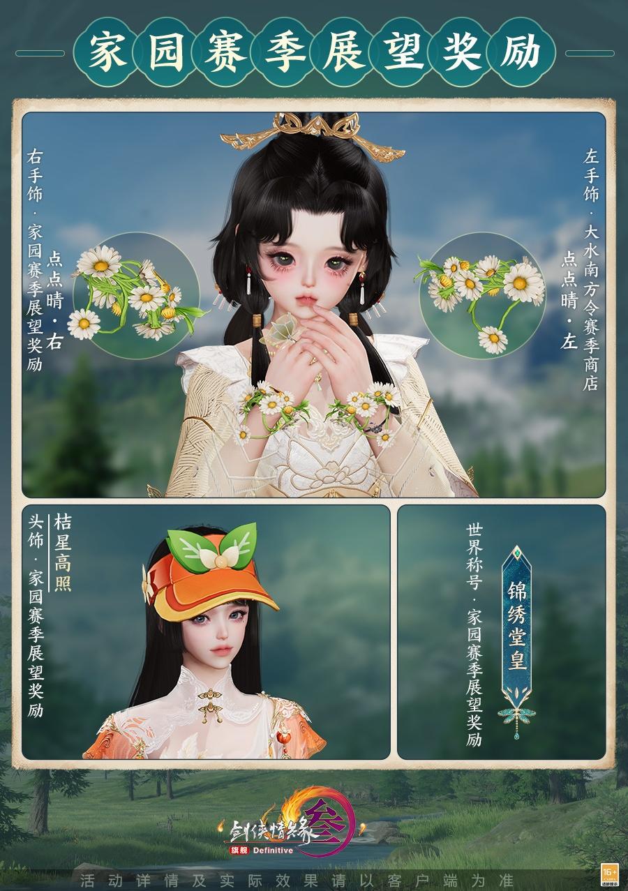 晓雾暮云,辰光辗转,将家园的美好藏进每一次耕耘。侠士达成家园新赛季展望目标后,即可获得手饰【点点晴·右】、头饰【桔星高照】及更多奖励!
