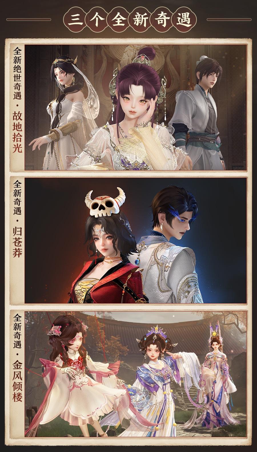 绝世奇遇“故地拾光”定制发型高贵典雅,跟宠奖励萌动可爱;奇遇“归苍莽”眼饰凝光作刃,头饰野性难羁;奇遇“金风倾楼”花仙伶影新至,戏韵风雅更浓,奇妙历程,待你邂逅!