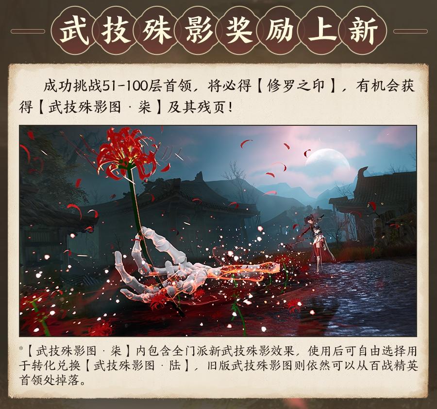 还有新一期全门派武技殊影图已上线!成功挑战51-100层首领,将必得【修罗之印】,还有机会获得【武技殊影图·柒】及其残页!