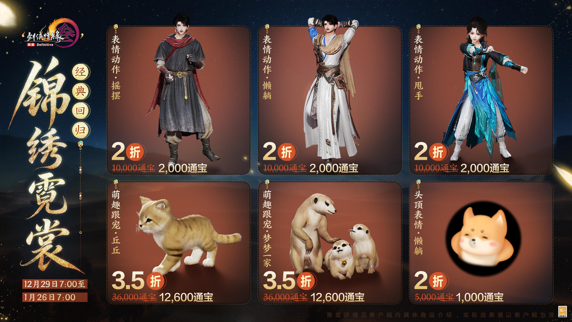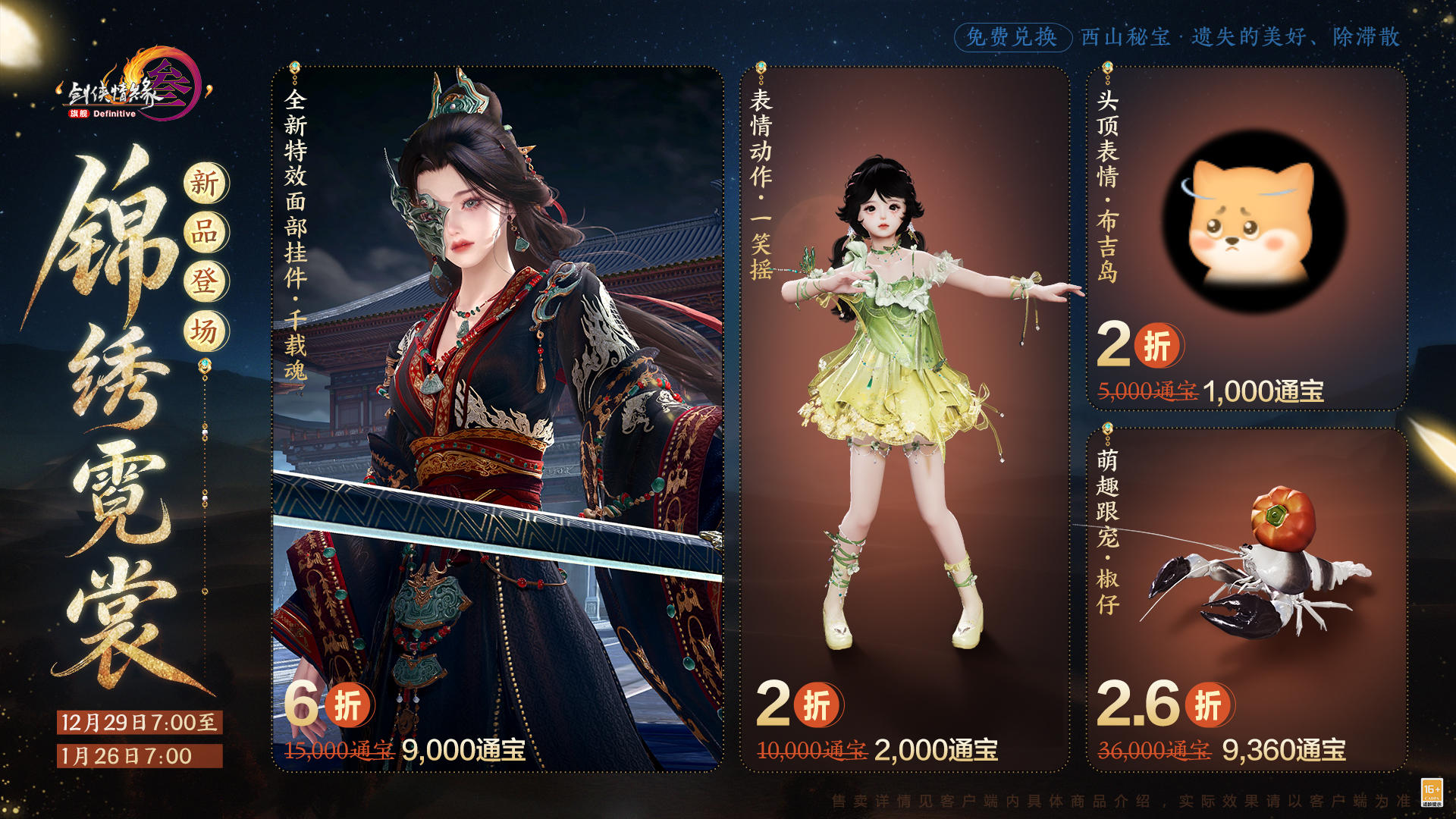 岁末将至,与侠士又共度一年!值此辞旧迎新之际,感恩诸位一路同行,特备好礼相赠!即日起所有满级侠士均可前往花萼楼领取【仙仪焕颜·自选】与【校服任选拓印券】,愿与侠士共赴新岁,同书江湖新篇章!