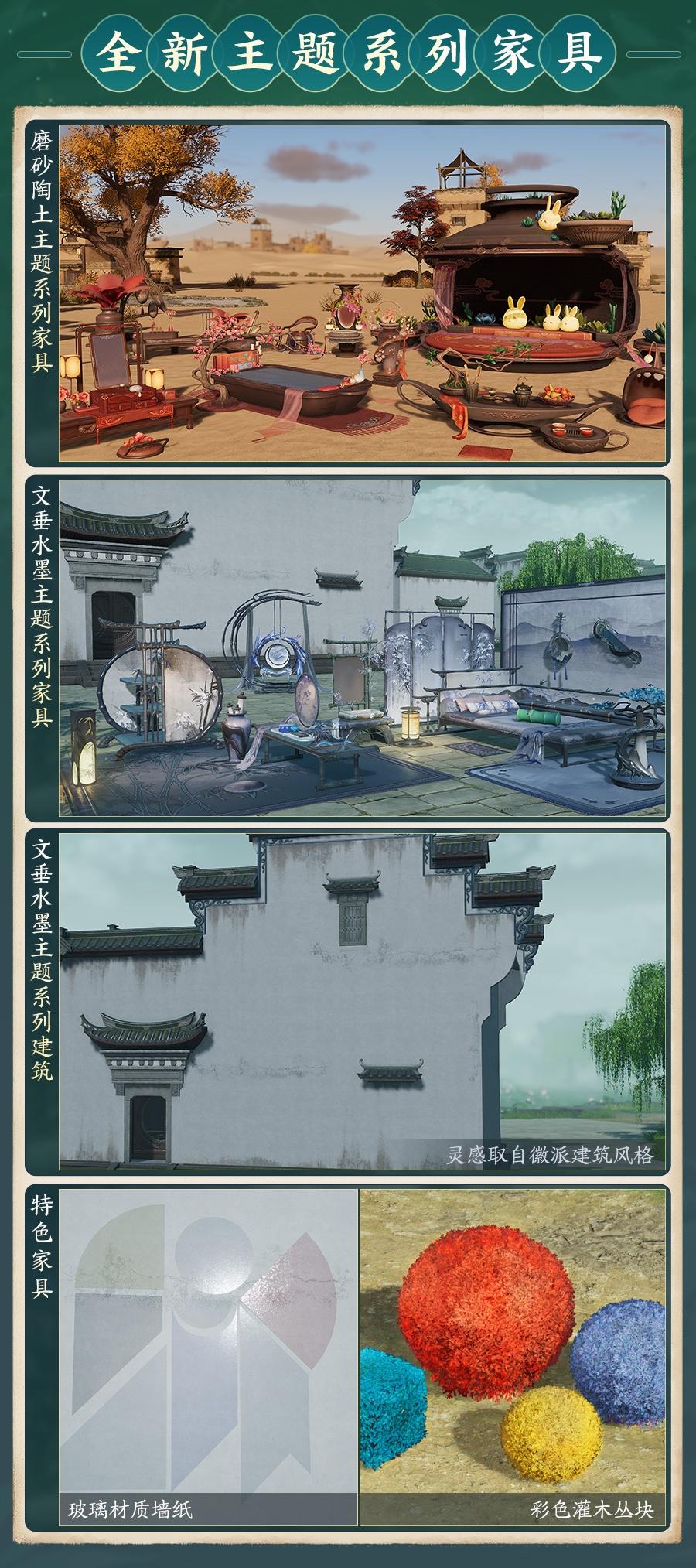 墨韵轻洇,淡雅入室。《剑网3》家园新赛季悠然启幕,全新文垂水墨主题建筑与家具、磨砂陶土主题系列家具及特色家具登场!无论是清隽简约、古朴大气,还是鲜活有趣、缤纷绚丽,多种选择助力侠士解锁更多创意灵感!