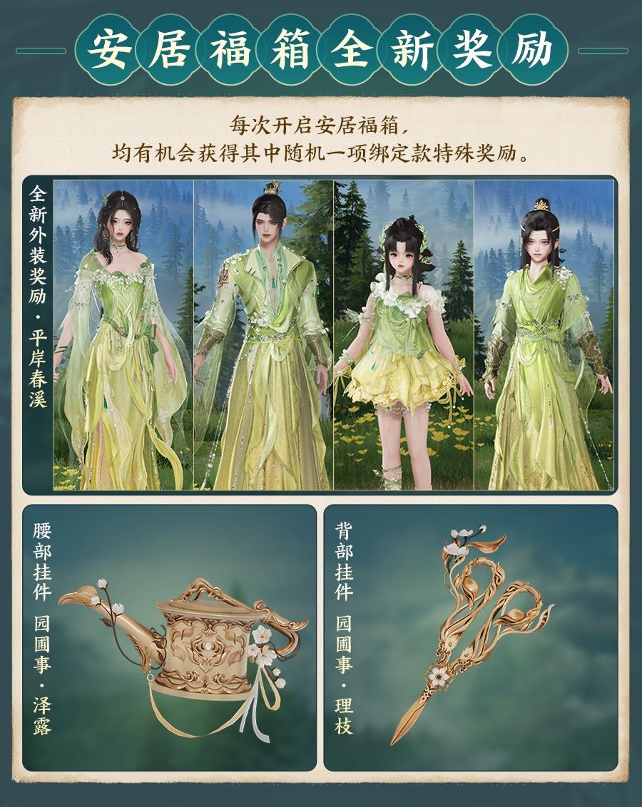 安居福箱全新奖励同步更新!全新外装奖励“平岸春溪”隐芳含幽,衣间藏翠盈春色满怀,“园圃事·泽露”壶身攀衍繁花蔓叶,“园圃事·理枝”裁得半帘芳意,凝萃家园惬意时光!